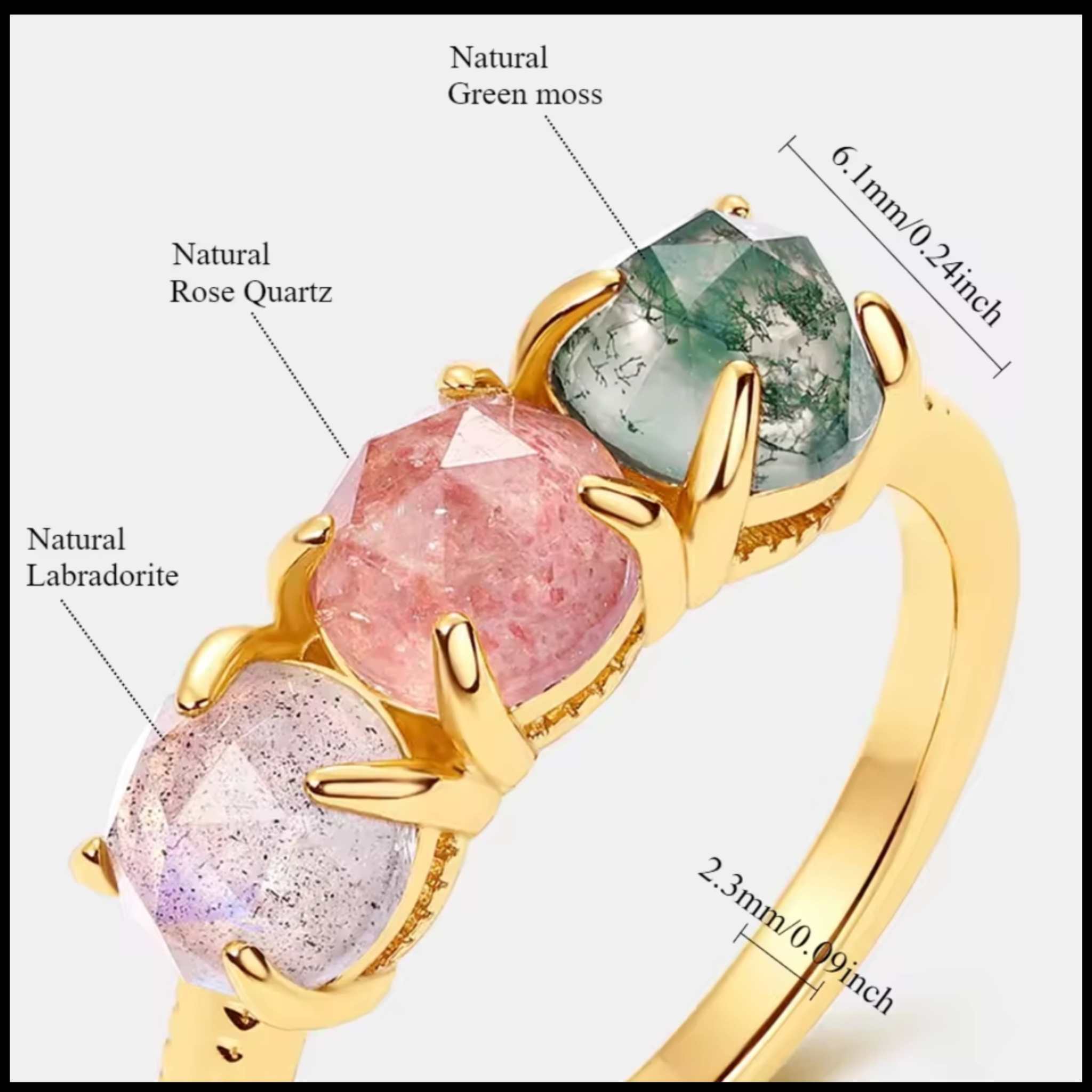 Make a statement with this exquisite three-stone ring, where Rose Quartz, Green Moss Agate, and...
