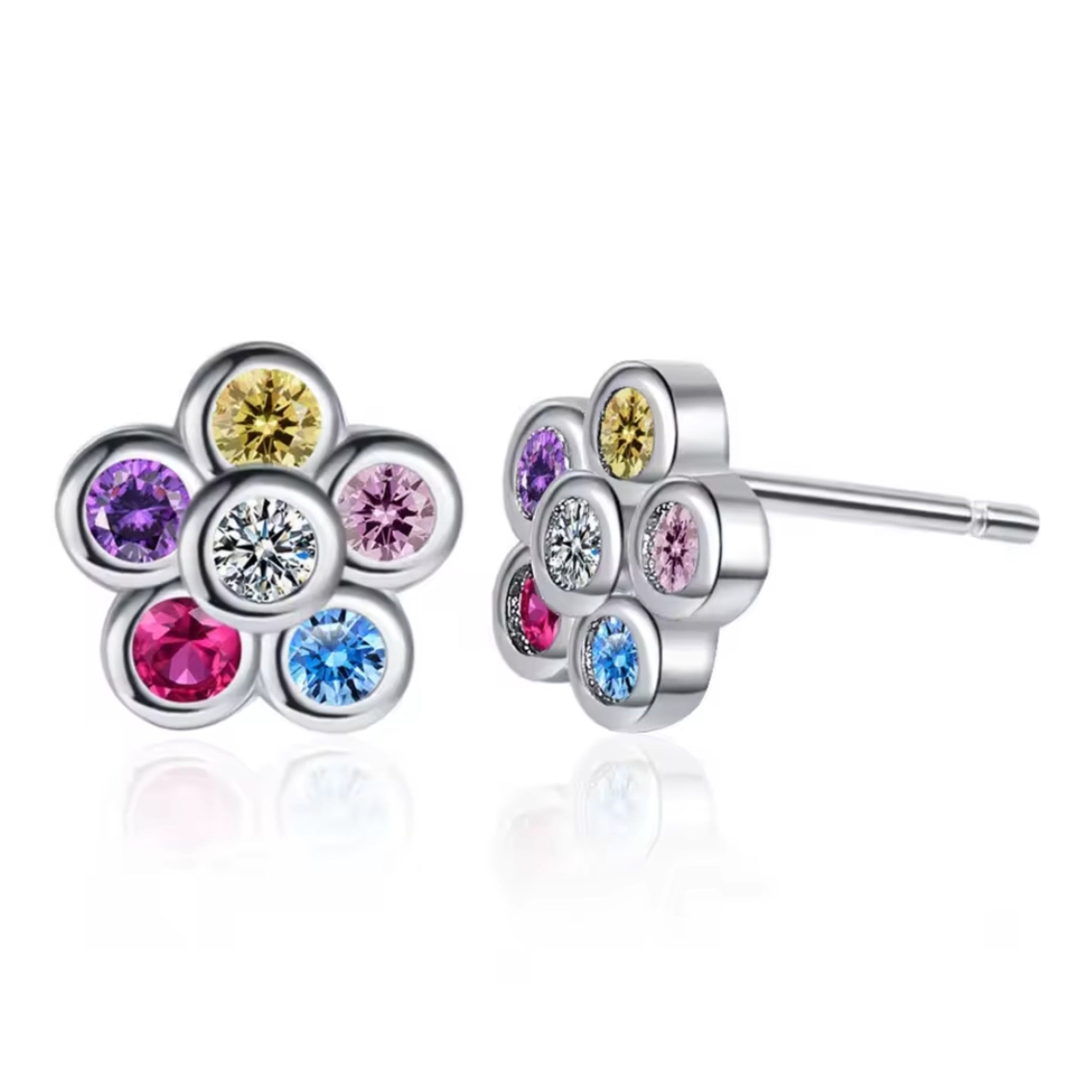 Bring a burst of colour and sparkle to your jewellery collection with these delightful multi-coloured flower design silver stud earrings. Each earring features a charming floral motif adorned with vibrant zirconia stones in an array of hues, creating a rainbow effect that catches the light beautifully from every angle. Crafted from solid silver, these studs offer both durability and elegance, making them perfect for everyday wear or special occasions. The zirconia stones are incredibly sparkly, delivering that coveted diamond-like brilliance without the hefty price tag. Whether you're heading to the office, meeting friends for brunch, or getting ready for an evening out, these earrings add an instant touch of joy and personality to any outfit. The cute flower design makes these studs a conversation starter – they're the kind of accessory that brings a smile to your face every time you catch your reflection. The multi-coloured stones mean they pair effortlessly with virtually any colour palette, from bold and vibrant to soft and neutral tones. They're versatile enough to complement casual jeans and a jumper or dress up an evening ensemble. These studs are ideal for anyone who loves a bit of sparkle and charm in their accessories. They make wonderful gifts for friends and family members who appreciate jewellery with personality and playfulness. The secure stud fastening ensures they stay put throughout the day, so you can enjoy your sparkly companions without worry. With their solid silver construction and high-quality zirconia stones, these earrings offer excellent value for money. They're proof that you don't need to compromise on style or quality to own jewellery that makes you feel fabulous. Treat yourself or someone special to these absolutely adorable multi-coloured flower studs today.