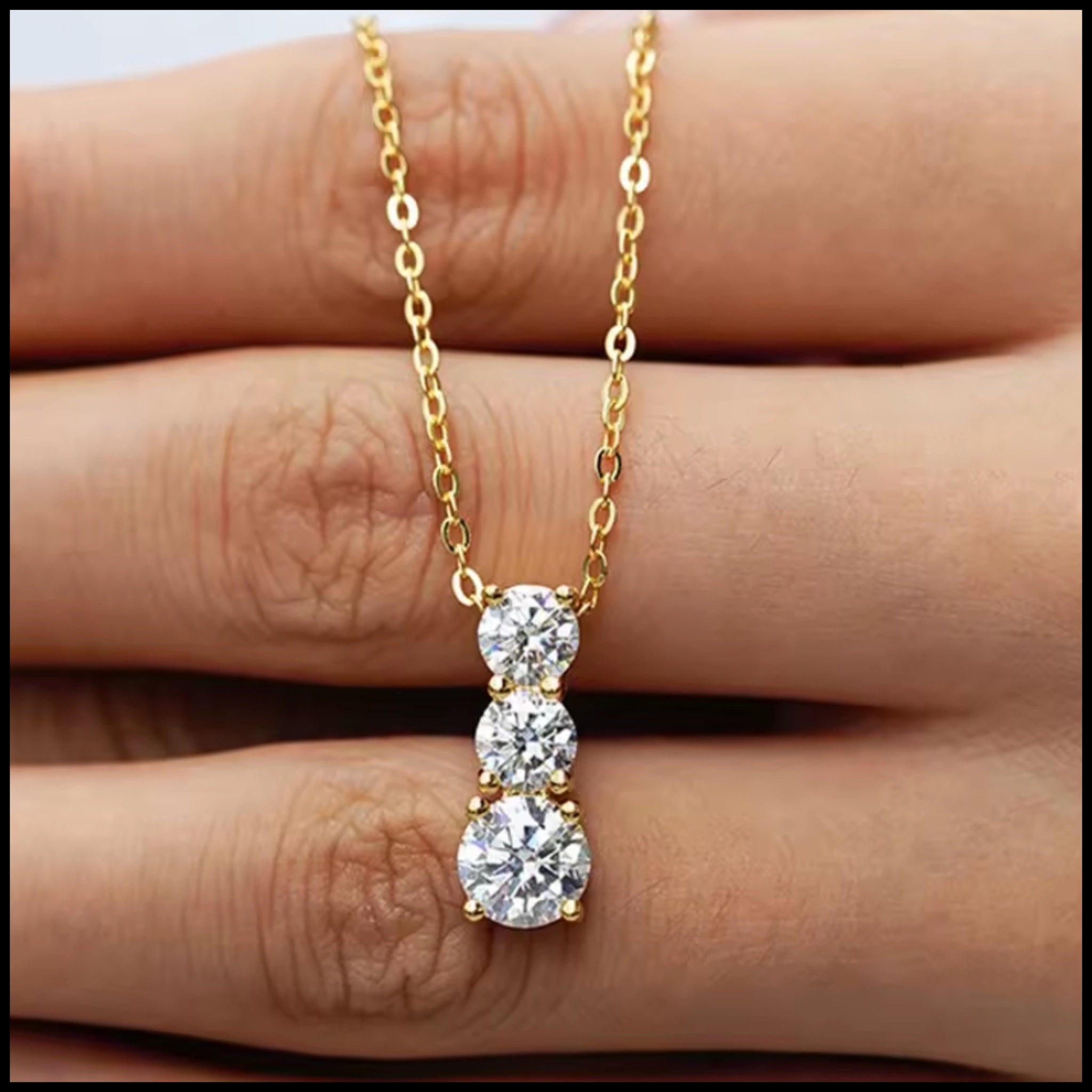 This exquisite three-stone moissanite necklace showcases a total of 2 carats set in solid silver with triple-layer gold plating for lasting shine and no tarnish. The centrepiece features a remarkable 6.5mm, 1ct moissanite of D - VVS1 colour and clarity, complemented by two 5mm, 0.5ct stones on each side. Designed to embody elegance and brilliance, this necklace promises to be a timeless addition to any sophisticated collection.